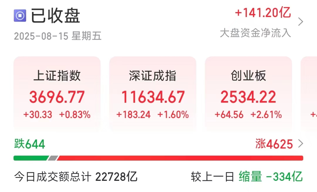 【大河财立方消息】8月15日,A股市场持续走强。截至收盘,沪指涨0.83%,盘中一度突破3700点;深证成指涨1.60%,创业板指涨2.61%。全天成交额2.27万亿元,连续三个交易日破2万亿。