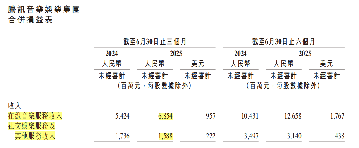 从最直观的营收数据来看,2025年Q2,腾讯音乐总收入84.4亿元,同比增长17.9%;公司权益持有人应占净利润24.1亿元,同比增长43.2%。其中,在线音乐服务收入为68.5亿元,同比增长26.4%;社交娱乐及其他服务收入15.9亿元,同比减少8.5%。