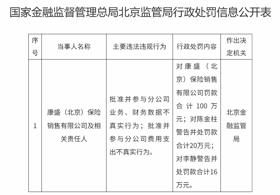 【大河财立方消息】8月15日,北京金融监管局披露的行政处罚信息显示,康盛(北京)保险销售有限公司因批准并参与分公司业务、财务数据不真实行为,批准并参与分公司费用支出不真实行为,合计被罚100万元。