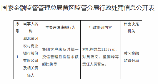 【大河财立方消息】8月16日,国家金融监督管理总局黄冈监管分局披露的行政处罚信息公开表显示,湖北黄冈农村商业银行股份有限公司因集团客户未及时统一授信管理且授信余额超比例等,被罚115万元。