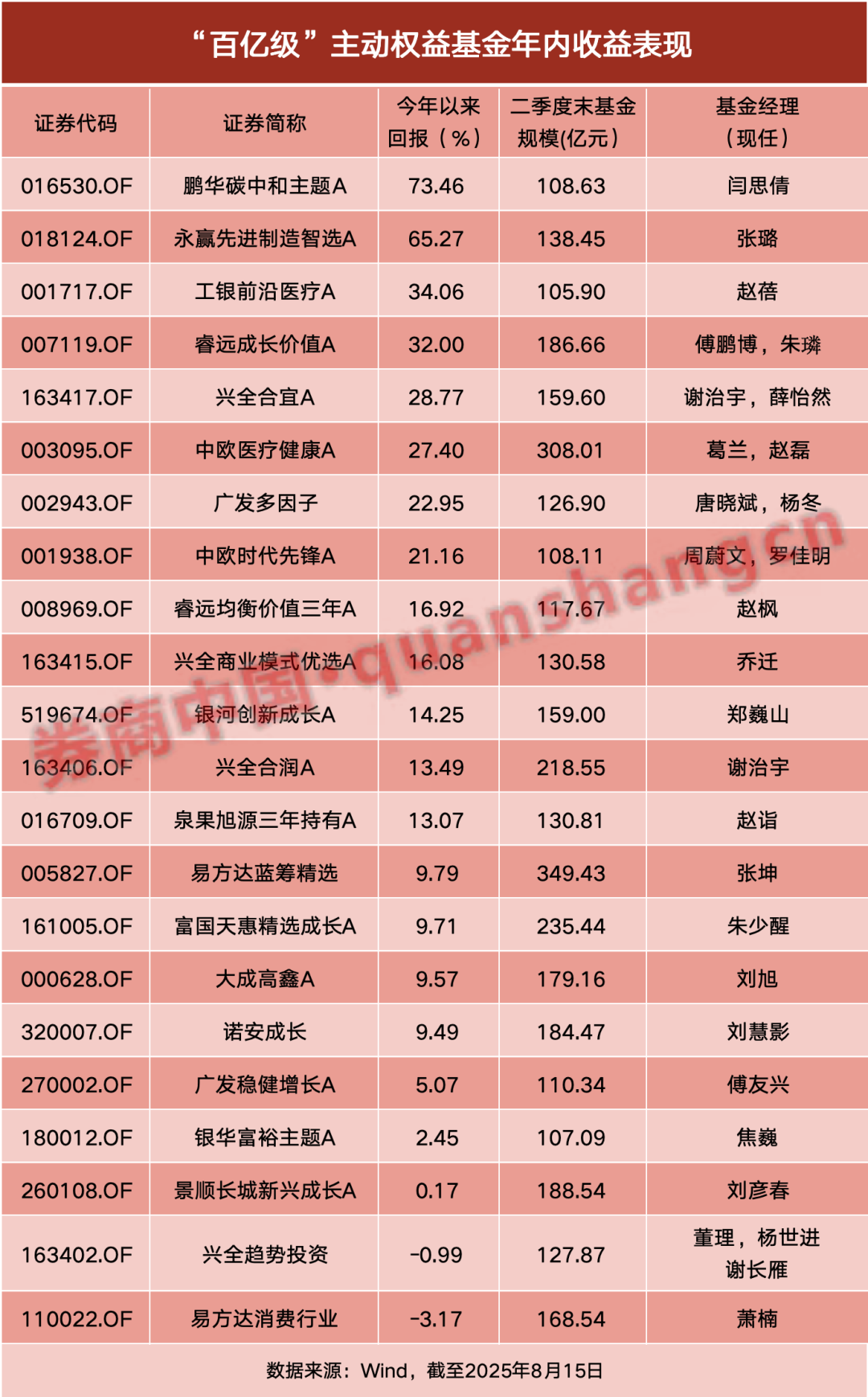 截至2025年上半年末,全市场共计有22只“百亿级”主动权益基金,截至8月15日,上述基金多数实现正收益。