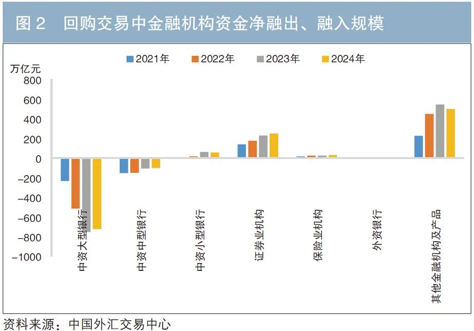 从回购市场来看,债券回购交易存在流动性传导链条,使得各交易主体的资产负债表更加紧密地联系在一起。其传导路径是:中资大型银行和中型银行是主要的资金融出方,小型银行、证券类和保险类机构及资管产品等是主要的资金融入方(盛松成等,2021)。从2021—2024年的数据看,回购交易中多类金融机构的净融出和净融入规模整体均在增加(见图2)。其中,资金融入方大多属于影子银行部门,其监管约束相对于银行业金融机构而言较为宽松,且部分交易链条较长,这加剧了回购市场的脆弱性。由此可见,回购交易环节相对薄弱,可能成为债券市场乃至整个金融市场交易资金不畅的潜在风险点。