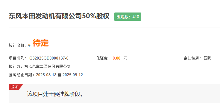 【大河财立方消息】8月18日消息,广东联合产权交易中心披露,东风汽车集团股份有限公司将出售东风本田发动机公司50%股权。目前该项目处于预挂牌阶段,转让底价待定,挂牌截止日期为9月12日。