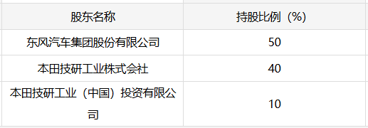 公告显示,东风本田发动机有限公司位于广州市黄埔区,股东为东风汽车集团股份有限公司、本田技研工业株式会社、本田技研工业(中国)投资有限公司,持股比例分别为50%、40%、10%。