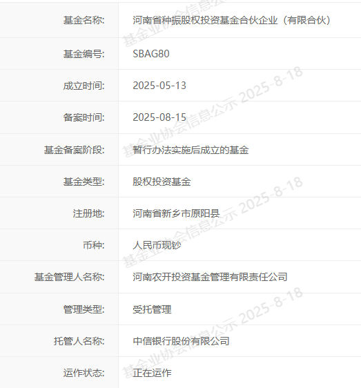 【大河财立方消息】8月18日消息,河南省种振股权投资基金合伙企业(有限合伙)日前在中基协备案。