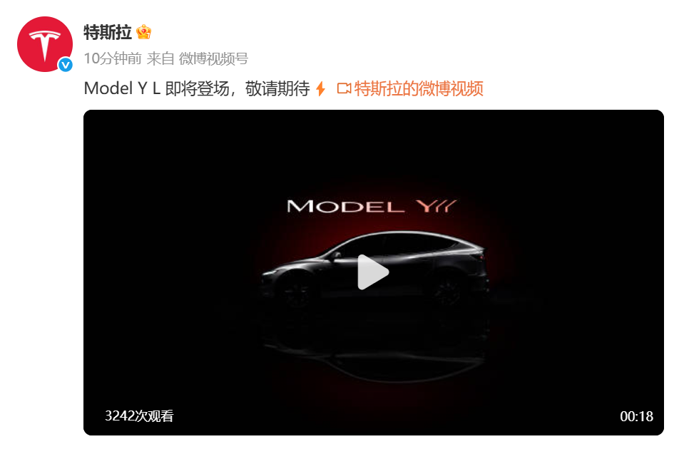 【大河财立方消息】8月18日,特斯拉中国在官微宣布,Model Y L即将登场。