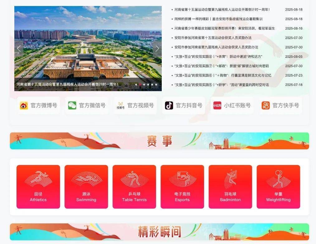 省运会官方网站共设置10个核心栏目,包括“通知公告”“新闻中心”“赛事服务”“残运专区”“志愿服务”“场馆导览”“精彩瞬间”“文化安阳”“赛事合作”及“首页”。具体功能涵盖三大方向:一是权威信息发布,实时更新官方公告、新闻动态、赛程赛果。二是赛事服务支撑,提供成绩查询、场馆导航、交通出行等实用信息。三是宣传推广功能,展示河南体育文化成果,同步推介安阳文旅资源。
