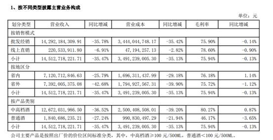 从产品类别来看,今年上半年,洋河股份中高档酒实现营收126.72亿元,同比下滑36.52%;普通酒实现营收18.41亿元,同比下滑27.24%。