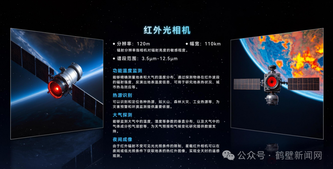 其中,红外相机分辨率120m,谱段范围3.5μm~12.5μm,能够在温度监测、热源识别、大气探测等方面发挥重要作用。
