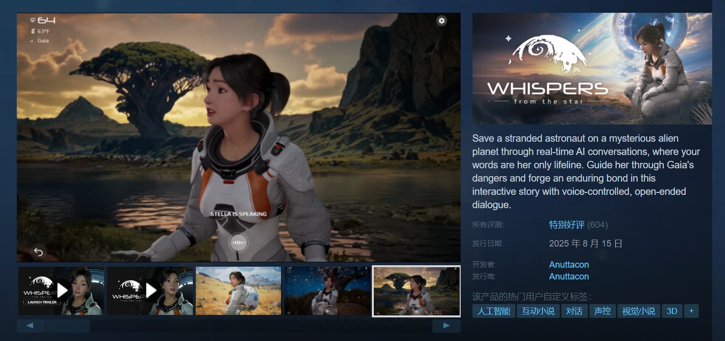 公开信息显示,《群星低语》的核心玩法在于通过玩家第一人称视角与AI游戏角色Stella对话,从而推动情节发展。根据情节设定,Stella是一名迫降在外星世界盖亚的女宇航员,玩家是她唯一能通过通讯器联系的人,玩家通过语音、文字输入引导其行动,每个决策都会触发不同情绪反应并影响后续剧情分支,最终导向多个结局。