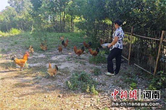 图为夏玲在喂养三高青脚黄鸡3号。杨劲松 摄