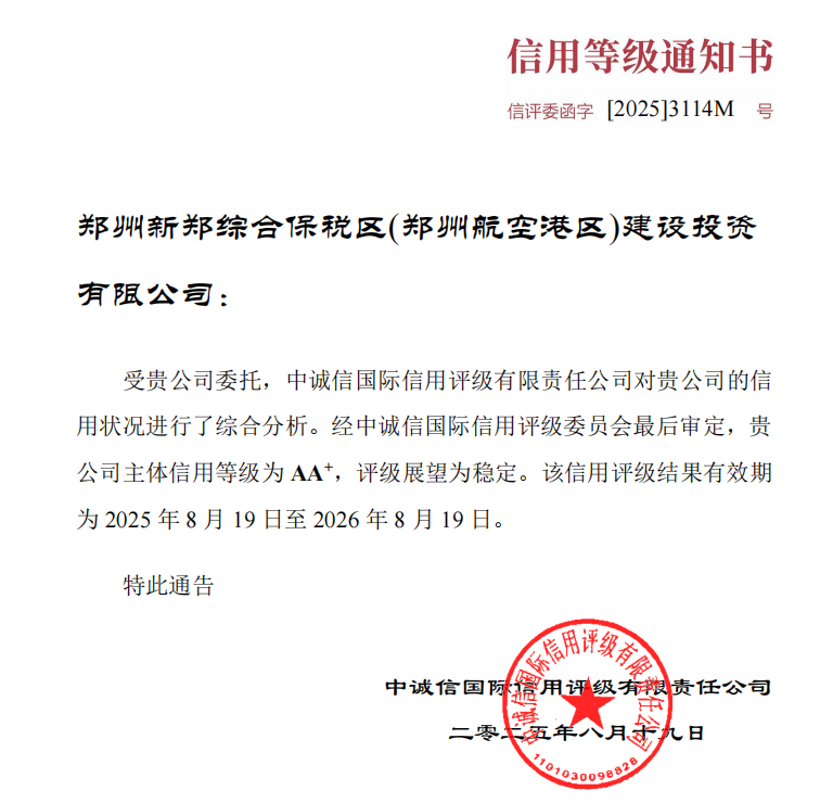 【大河财立方消息】8月19日,经中诚信国际综合评定,郑州新郑综合保税区(郑州航空港区)建设投资有限公司获评AA+主体信用评级,展望稳定,成为郑州航空港科创集团旗下首家获得AA+评级的子公司。