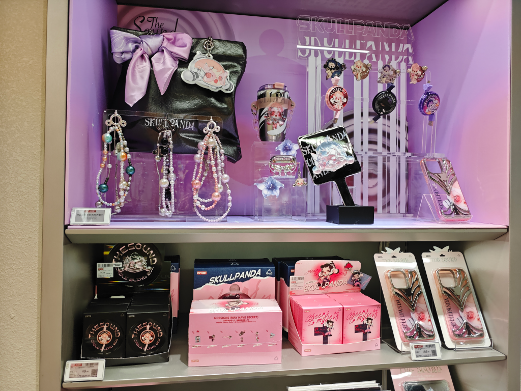 店内IP周边品类众多,如另一款核心IP SKULLPANDA推出了水杯、手机壳、手机挂件、勋章、数据线等产品。此外,除了泡泡玛特自有的艺术家IP,记者看到,门店里还有天线宝宝、蜘蛛侠等知名IP。