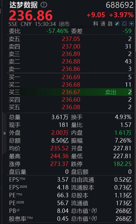 截至收盘,达梦数据股价报236.86/股,最新市值268亿元。