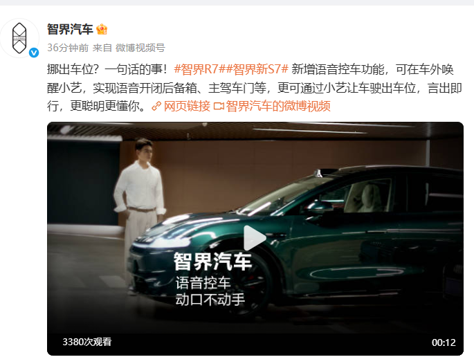 8月22日,智界汽车官宣智界R7、智界新S7将首发车外语音控车功能,可在车外唤醒小艺,实现语音开闭后备箱、主驾车门等。