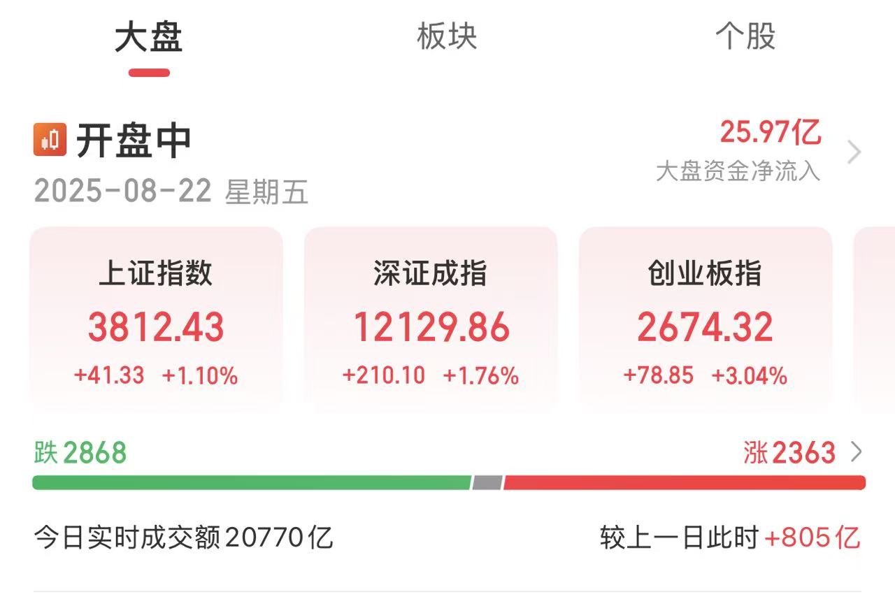 【大河财立方消息】8月22日,A股指数持续走强,创业板指拉升涨逾3.00%,沪指涨1.10%,深成指涨1.76%,科创50指数涨近8%。半导体芯片、证券、算力硬件等方向涨幅居前,沪深京三市上涨个股2363只。