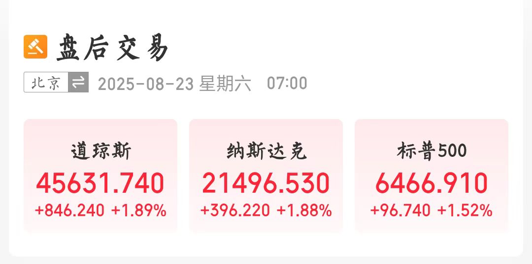 【大河财立方消息】美东时间周五,美股三大指数集体收涨,其中道指涨1.89%报45631.740点,创历史新高,标普500指数涨1.52%,纳指涨1.88%。