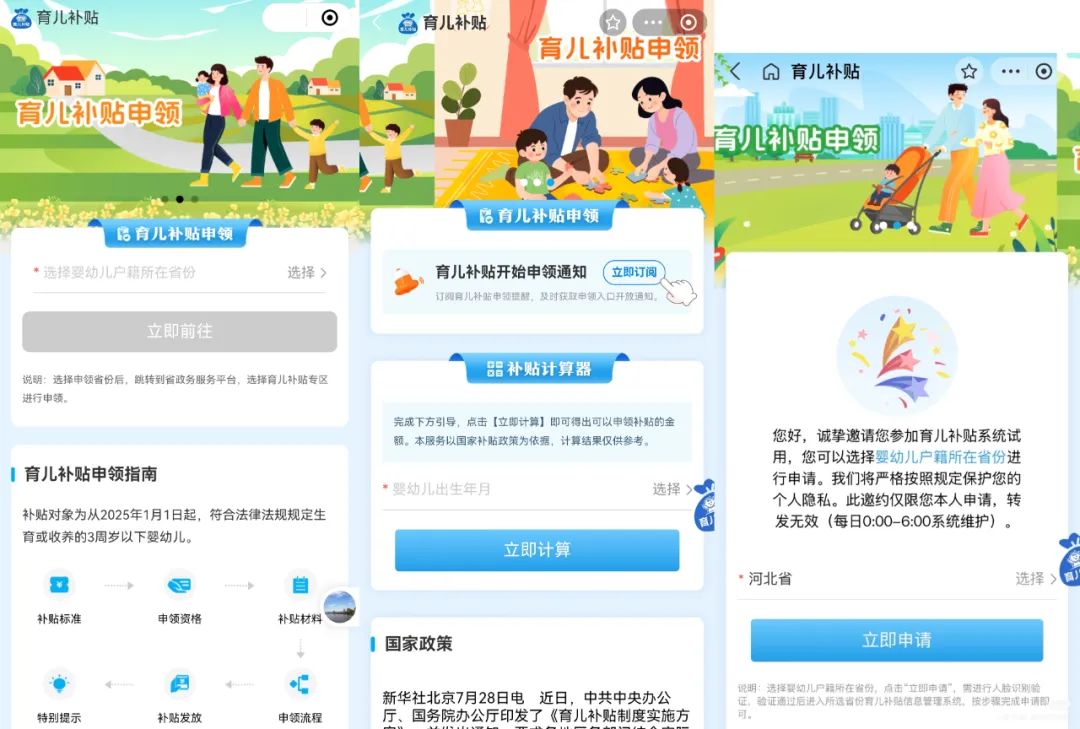 部分地区已透露育儿补贴申领的开放时间。比如,甘肃省将于8月26日正式上线,湖北省则定于8月27日开通。