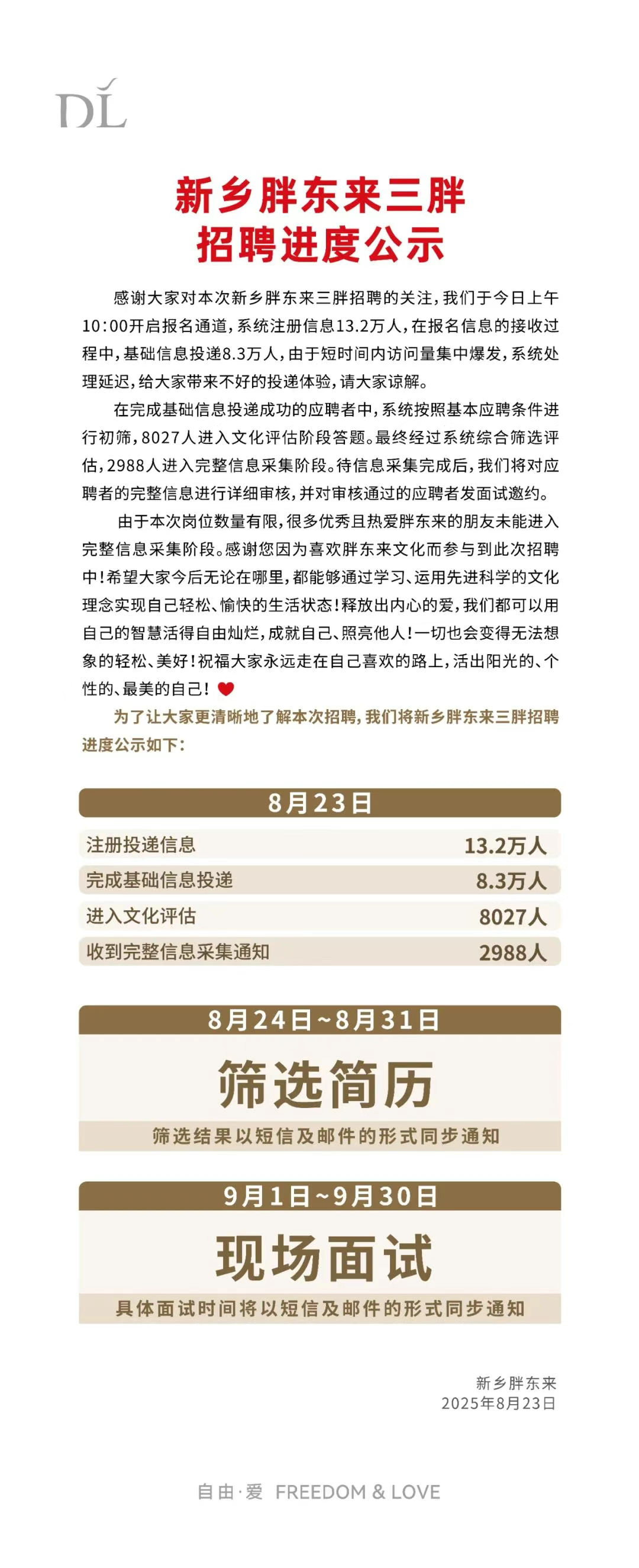 胖东来凌晨公示招聘进度