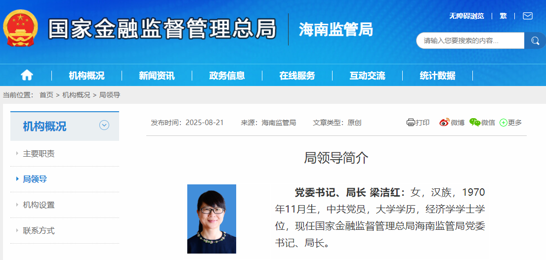 海南金融监管局官网更新信息显示,梁洁红已出任该局党委书记、局长。她曾先后担任原厦门银监局副局长、原厦门银保监局副局长、原福建银保监局副局长、福建金融监管局副局长等职。此前,海南金融监管局局长一职由王吴庆担任。