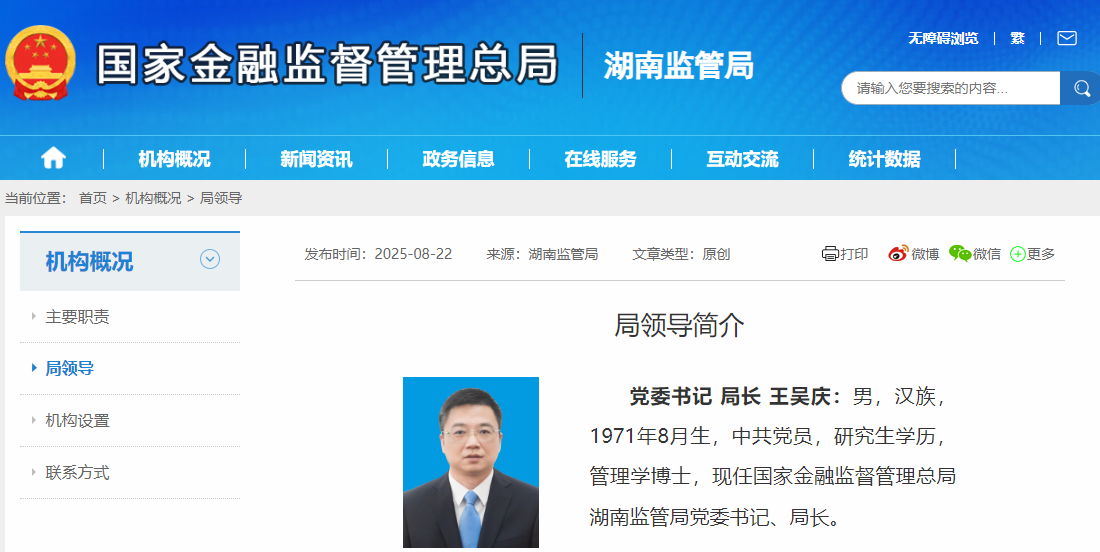 【大河财立方消息】8月25日消息,湖南金融监管局官网更新信息显示,王吴庆已出任该局党委书记、局长。他曾先后担任原广东银保监局副局长、海南金融监管局局长等职。此前,湖南金融监管局局长一职由向恒担任。