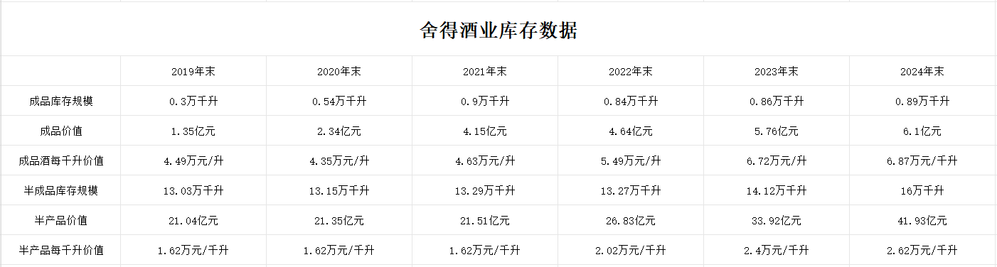 舍得酒业未在年报中披露基酒及成品酒储量,因此,截至2024年末,公司成品酒、半成品酒库存规模分别为0.89万千升、16万千升,较2019年末分别增长约0.69万千升、2.97万千升。