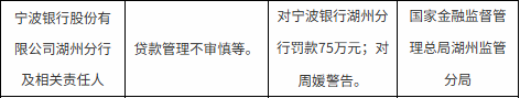 【大河财立方消息】8月25日,国家金融监督管理总局湖州监管分局披露的行政处罚信息显示,因贷款管理不审慎等,宁波银行湖州分行被罚款75万元,相关责任人周媛被警告。