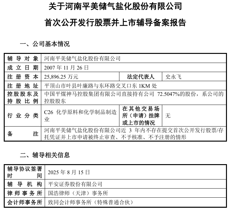 【大河财立方消息】8月27日,证监会网站显示,河南平美储气盐化股份有限公司(以下简称平美盐化)已启动上市辅导,辅导机构为平安证券。