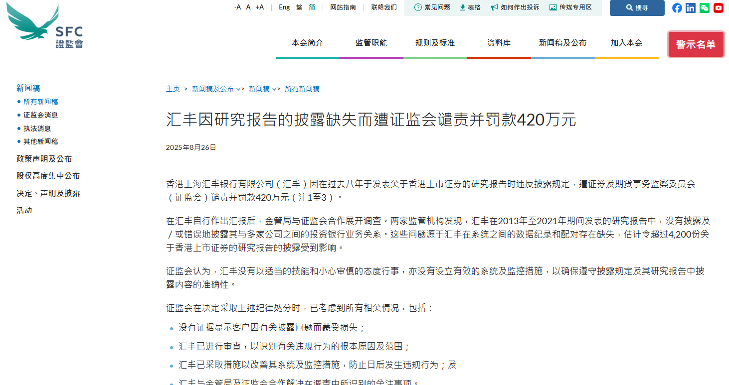 【大河财立方消息】8月26日,香港证监会披露,因在过去八年发表关于香港上市证券的研究报告时违反披露规定,对香港上海汇丰银行有限公司(以下简称汇丰银行)谴责并罚款420万港元。