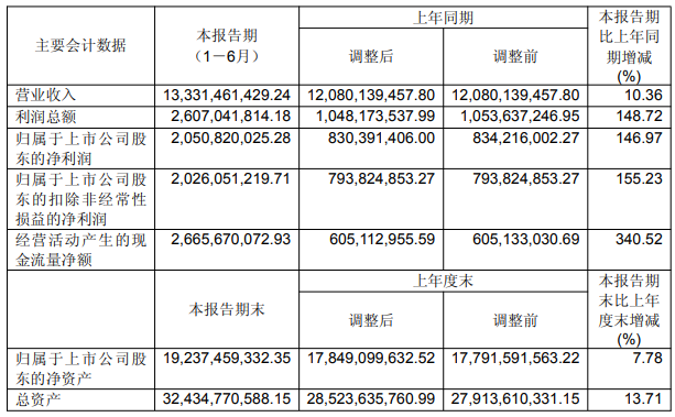 巨化股份上半年实现营业收入133.31亿元,同比增长10.36%;利润总额达到26.07亿元,同比增长148.72%;实现归母净利润20.51亿元,同比增长146.97%。