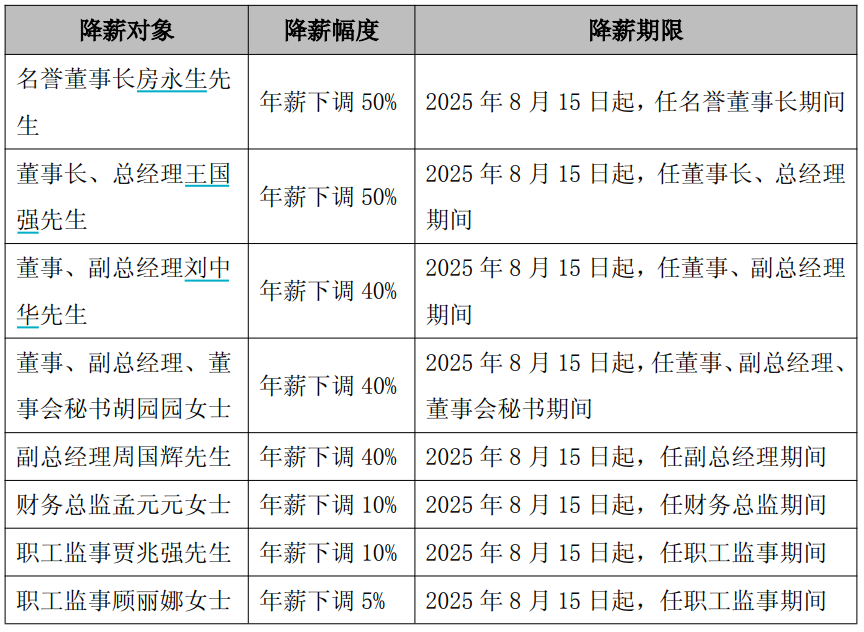 公告披露,名誉董事长房永生、董事长兼总经理王国强等8人年薪将下调,下调幅度在5%至50%不等,自2025年8月15日起生效。