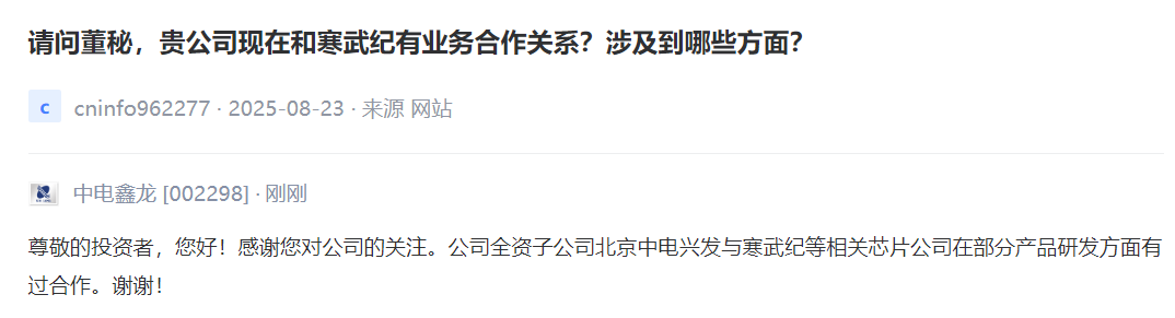 【大河财立方消息】8月28日,有投资者在互动平台询问中电鑫龙,现在和寒武纪有业务合作关系?涉及到哪些方面?