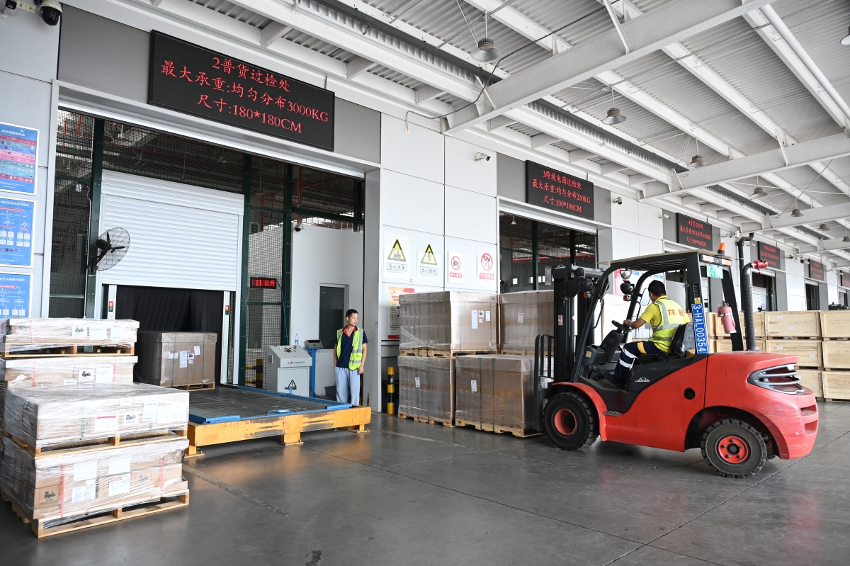 另一边的进港区,叉车师傅熟练操作,将一板板货物送向称重台。鄂州空港货运公司货站管理部负责人刘晨介绍,这是将发往美国芝加哥的手机。