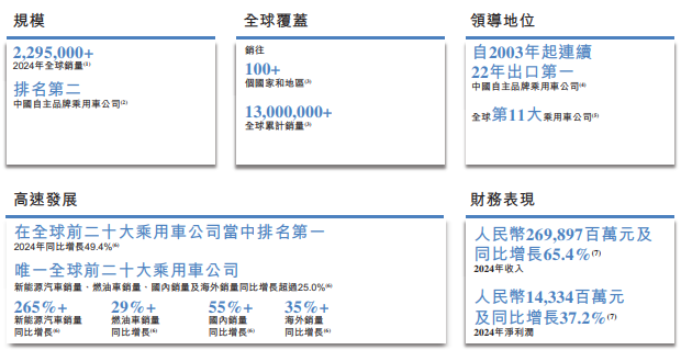 奇瑞汽车是一家乘用车公司,总部位于中国芜湖。设计、开发、制造和销售多样化且不断扩展的乘用车产品组合,包括燃油车和新能源汽车。根据弗若斯特沙利文的资料,以2024年的全球乘用车销量计算,奇瑞汽车是中国第二大自主品牌乘用车公司和全球第十一大乘用车公司。2024年,奇瑞汽车乘用车销量较2023年增长49.4%,增速位居全球前二十大乘用车公司之首。