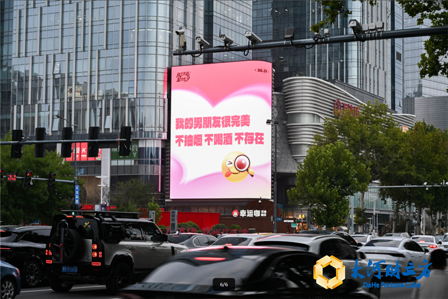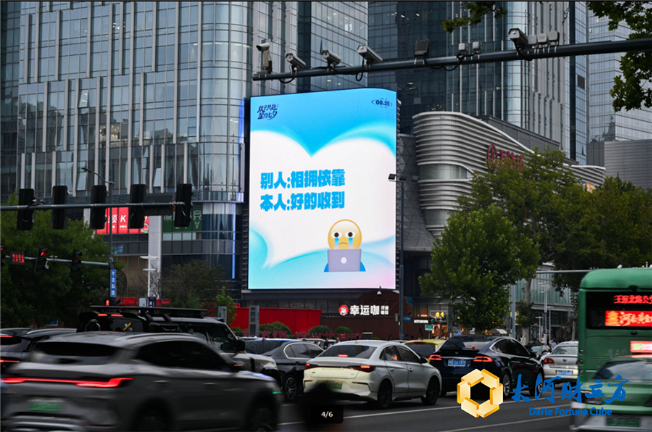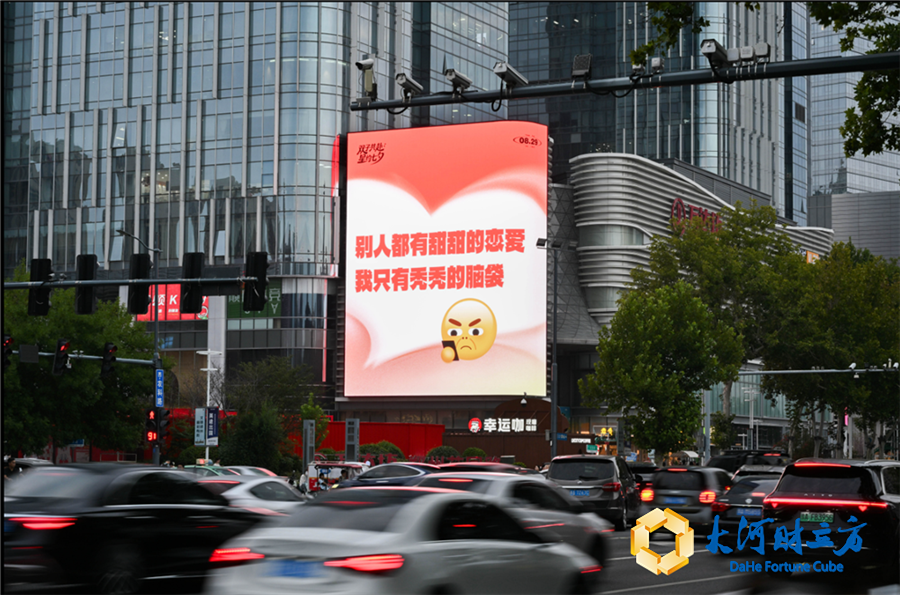 从8月26日起,“郑州双子星”大屏就以极具创意的视觉语言成为全城焦点。白天的“恋爱发疯文学”以幽默自嘲的方式纾解节日焦虑,不少观众笑着举起手机记录下那些令人捧腹的标语。