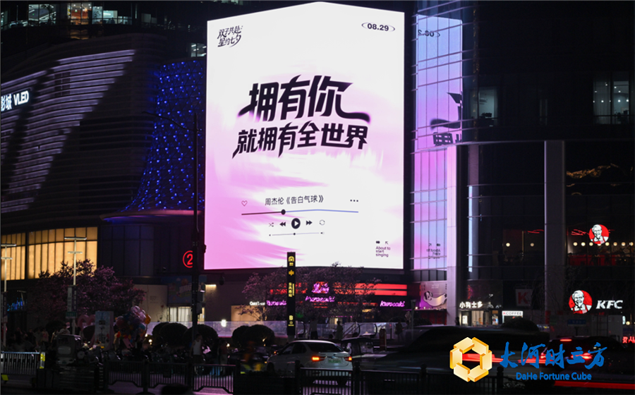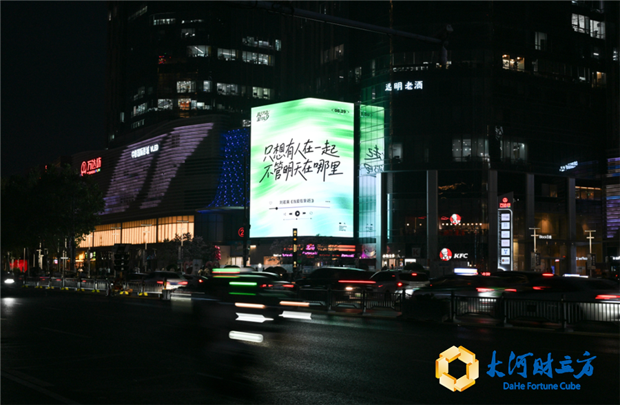 而当夜幕降临,大屏切换为“夜间心动模式”,动态流星与经典情歌歌词交织出现。