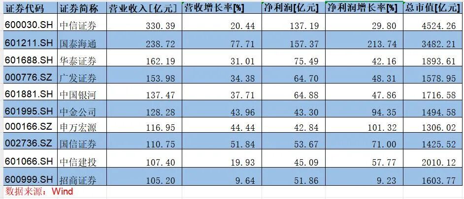 Wind数据显示,42家上市券商中,中信证券、国泰海通、华泰证券等10家上半年营业收入超过100亿元;广发证券、国信证券、招商证券等8家券商净利润超50亿元。