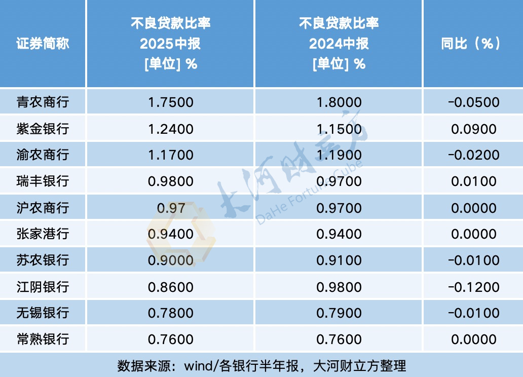 在各类银行中,我国农商行不良贷款率较高,但上市农商行整体不良贷款率较低。2025年上半年,除瑞丰银行、紫金银行不良贷款率同比上升外,其他银行均同比持平或下滑,其中,青农商行不良贷款率依然是10家上市农商行中最高。