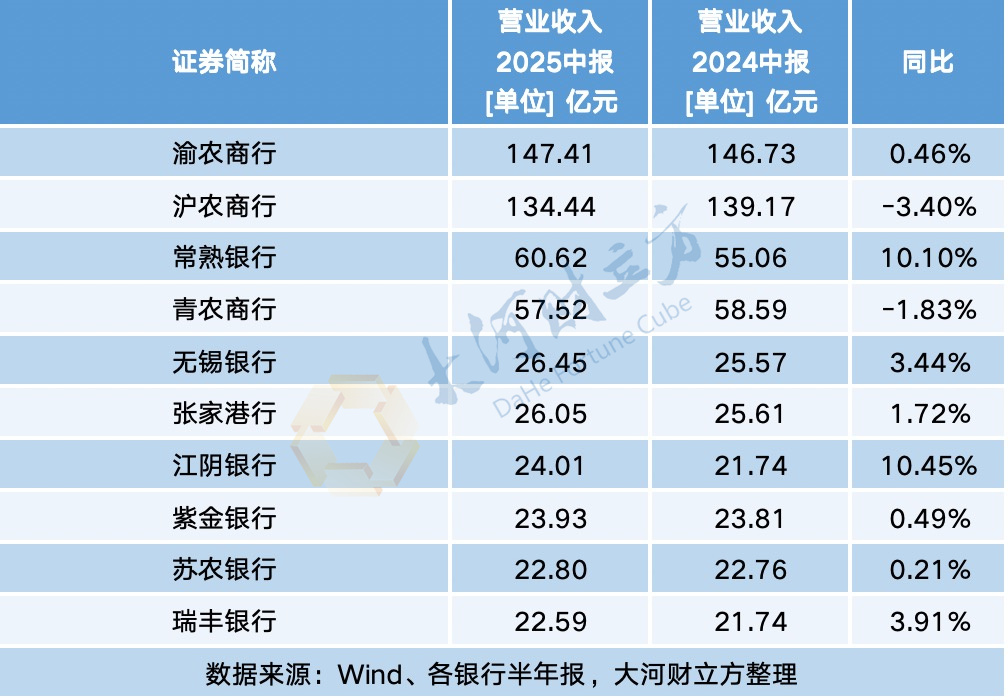 2025年上半年,10家上市农商行合计实现营业收入545.81亿元,其中,渝农商行以147.41亿元的营业收入位居榜首,同比增长0.46%。紧随其后的为沪农商行,2025年营业收入为134.44亿元,同比下滑3.40%。
