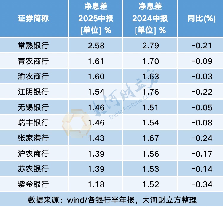 2025年上半年,10家上市农商行净息差全面下滑,下滑幅度从0.34个百分点到0.03个百分点不等。