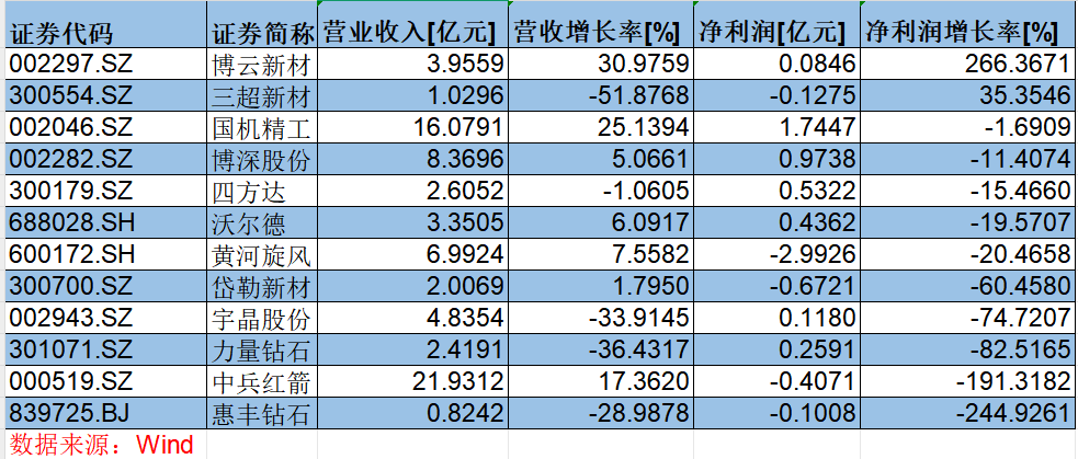 12家企业中仅博云新材、三超新材两家企业净利润实现增长,惠丰钻石、力量钻石、黄河旋风、四方达等10家企业净利润大幅下滑。