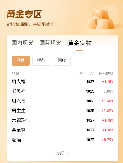 部分黄金饰品品牌价格同步上涨,周大福、周六生、周生生等品牌黄金饰品价格相较昨日出现上涨,稳定在1000元上方。