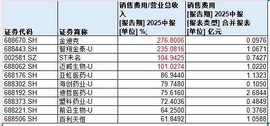 Wind数据显示,智翔金泰-U、迈威生物-U、亚虹医药-U、海创药业-U、迪哲医药-U等多数尚未盈利的药企销售费用率居于前列,甚至超过100%。不过,尚未盈利的药企销售费用比率高的现象在行业内较为普遍。