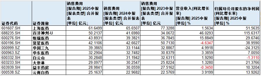 不仅销售费用总额收缩明显,销售费用超10亿元的企业数量也持续减少。记者统计,2023中报、2024中报、2025中报销售费用超10亿元的药企数量分别为44家、39家、35家。