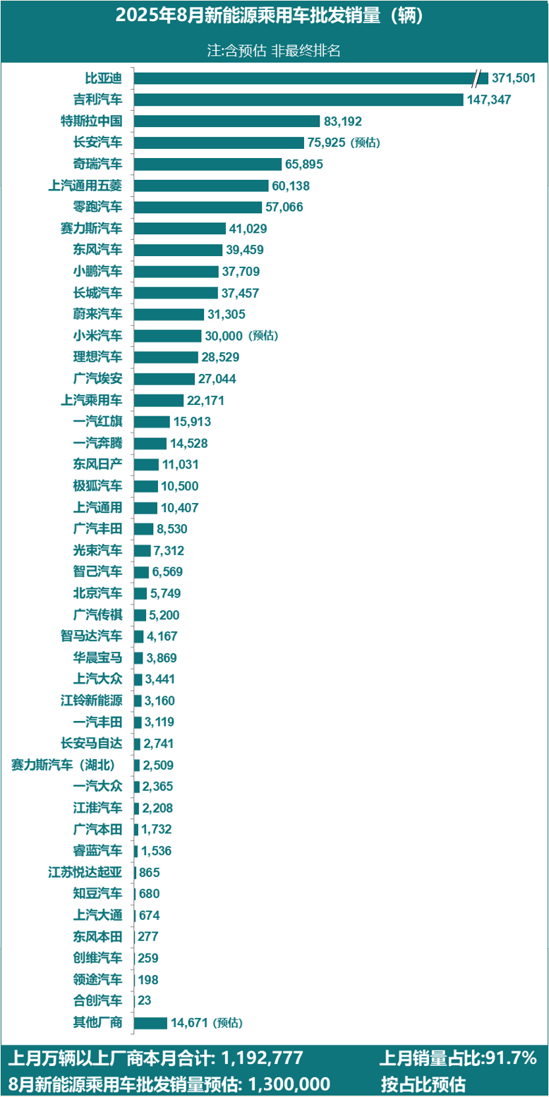 根据乘联分会数据,全国乘用车市场2025年7月新能源批发销量万辆以上厂商的销量之和,占总体新能源乘用车当月销量的91.7%。根据月初汇总数据,这些7月新能源批发销量万辆以上厂商的8月销量为119万辆。虽然由于休高温假的企业较多,但目前绝大部分厂商销量基本都已经锁定,因此按照上月结构占比结合本月数据,测算8月的全国新能源乘用车批发销量为130万辆。