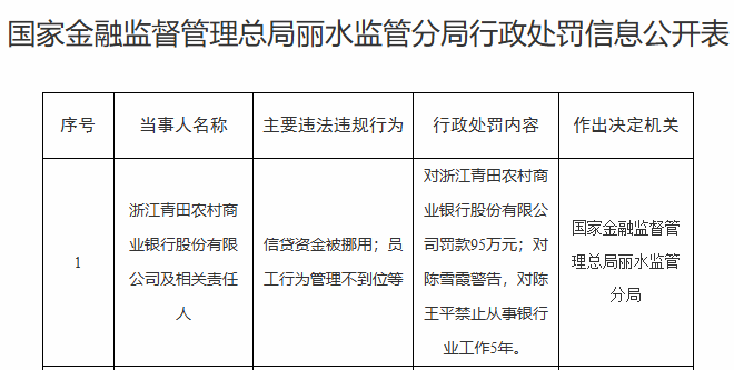 【大河财立方消息】9月2日消息,国家金融监督管理总局丽水监管分局披露的行政处罚信息公开表显示,因信贷资金被挪用、员工行为管理不到位等,浙江青田农村商业银行股份有限公司被罚95万元。