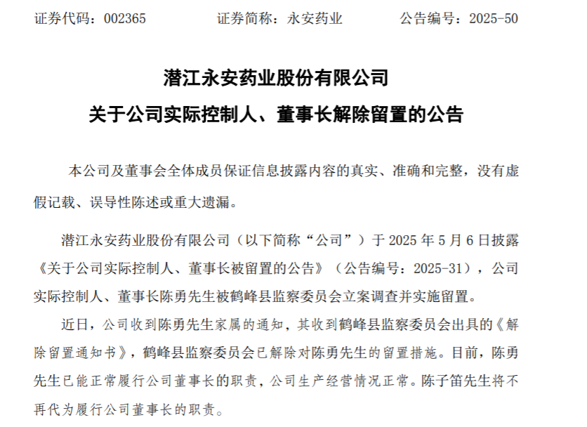 永安药业公告中表示,收到陈勇家属通知,其收到鹤峰县监察委员会出具的《解除留置通知书》,鹤峰县监察委员会已解除对陈勇的留置措施。目前,陈勇已能正常履行公司董事长的职责,公司生产经营情况正常。陈子笛将不再代为履行公司董事长的职责。