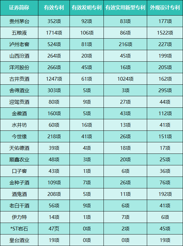 国家知识产权局数据显示,截至8月30日,A股20家白酒上市公司中,五粮液和古井贡酒的有效专利数量均超1000项,分别为1714项、1247项。泸州老窖、贵州茅台、舍得酒业3家酒企有效专利数量超300项,山西汾酒、洋河股份、今世缘、酒鬼酒有效专利数量超200项。