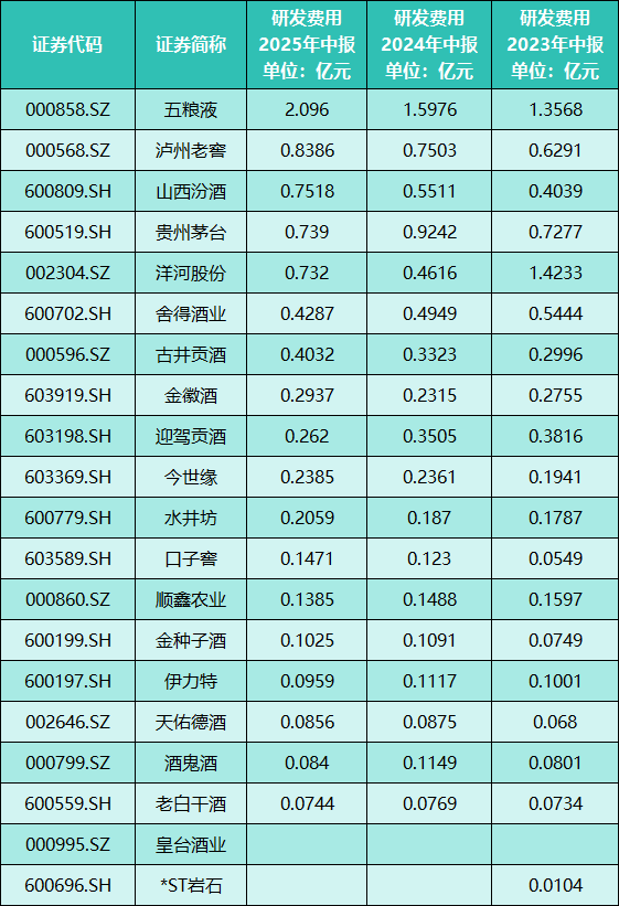 但从研发投入情况来看,2025年上半年,水井坊、口子窖、酒鬼酒研发投入分别为0.21亿元、0.15亿元、0.08亿元。在20家上市白酒企业中,其研发投入规模分别位于第11位、第12位、第17位。