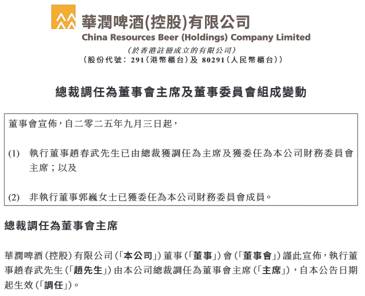 9月3日,华润啤酒发布公告称,执行董事赵春武由公司总裁调任为董事会主席,自公告日期起生效。因调任后总裁职位暂时空缺,所以在华润啤酒委任新总裁前,赵春武将暂时承担过渡期间总裁职责。